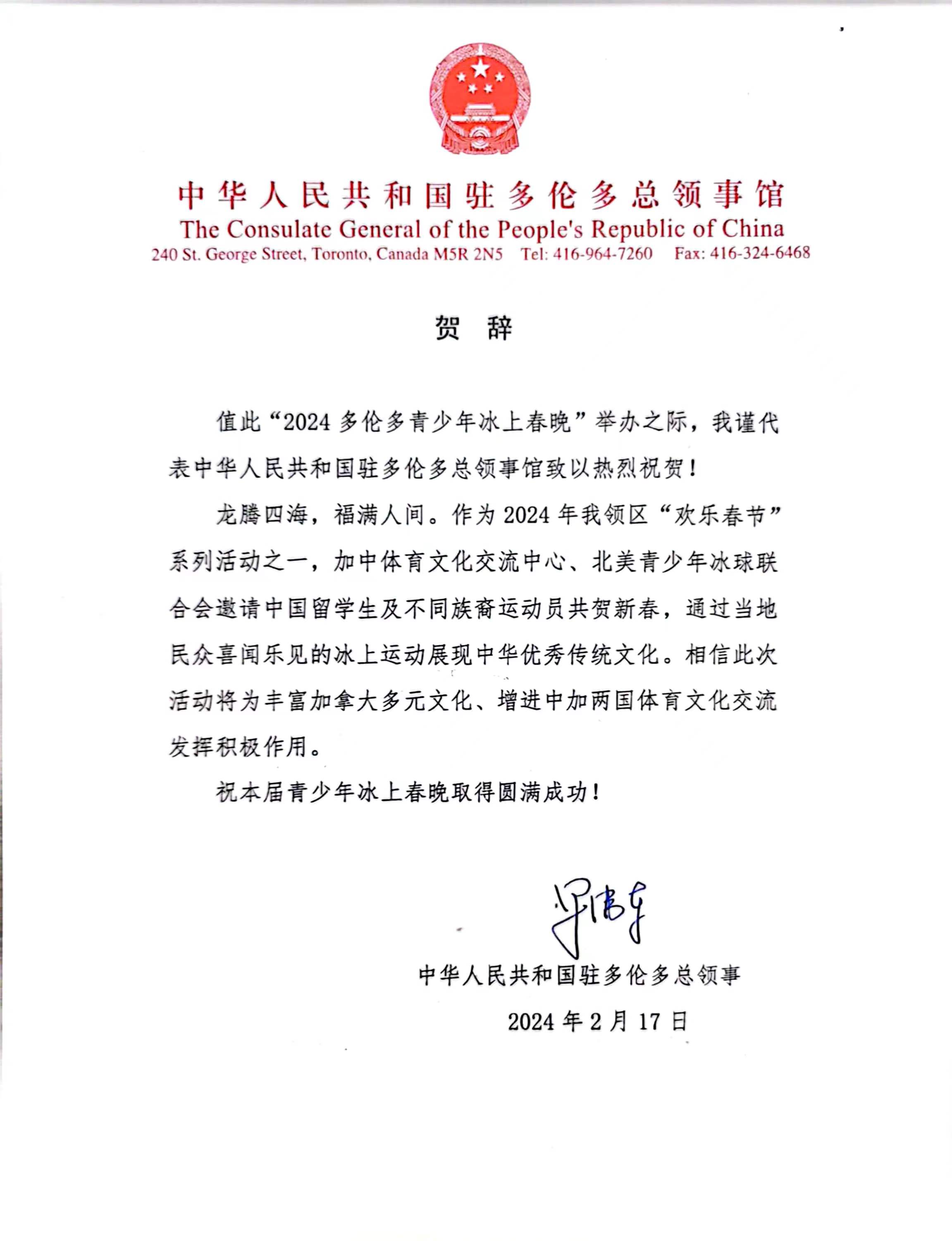 “2024多伦多青少年冰上春晚”成功举办——加拿大总理特鲁多,中国驻加领事馆,中国国际露营大会组织委员会发来贺信